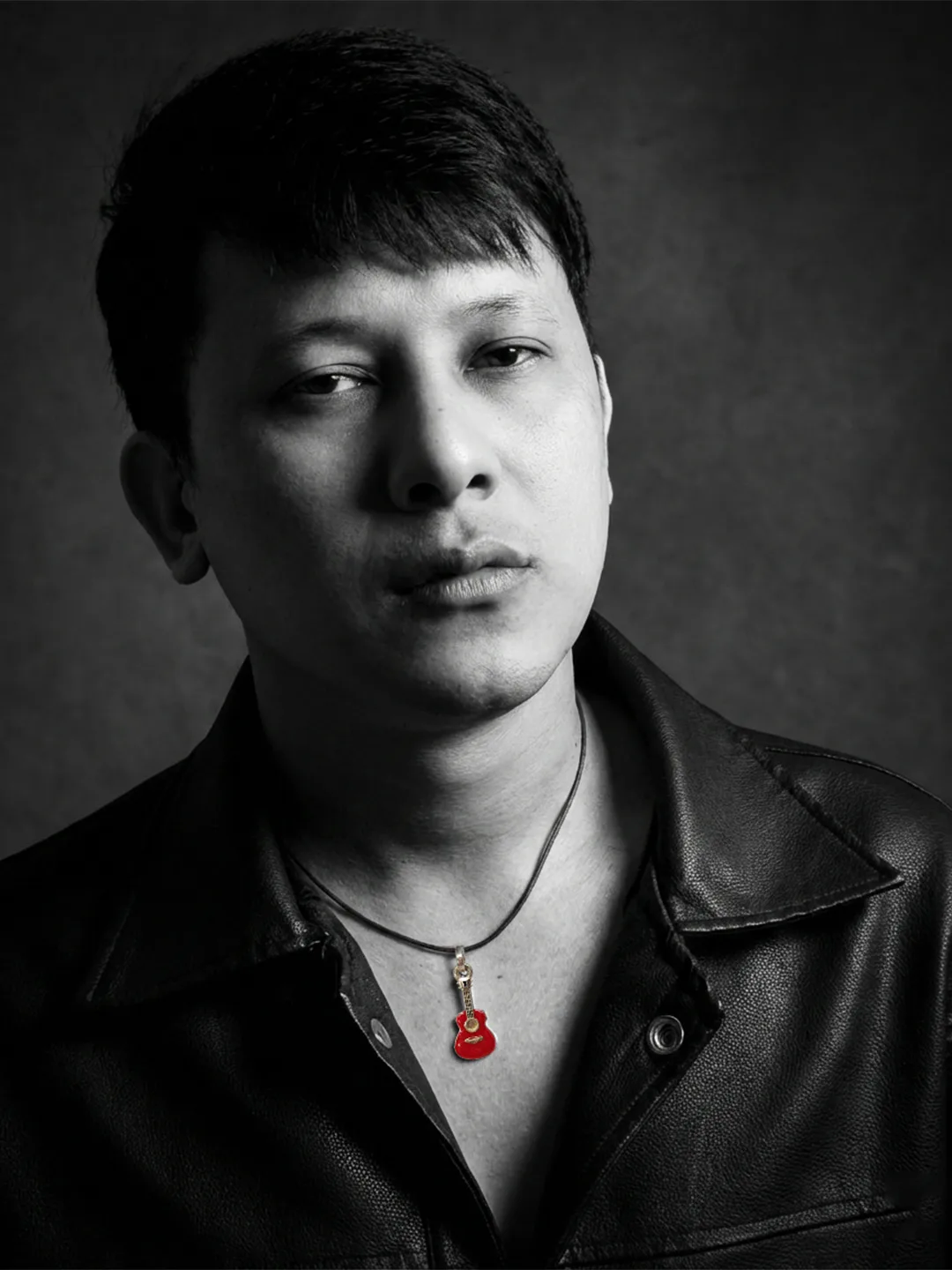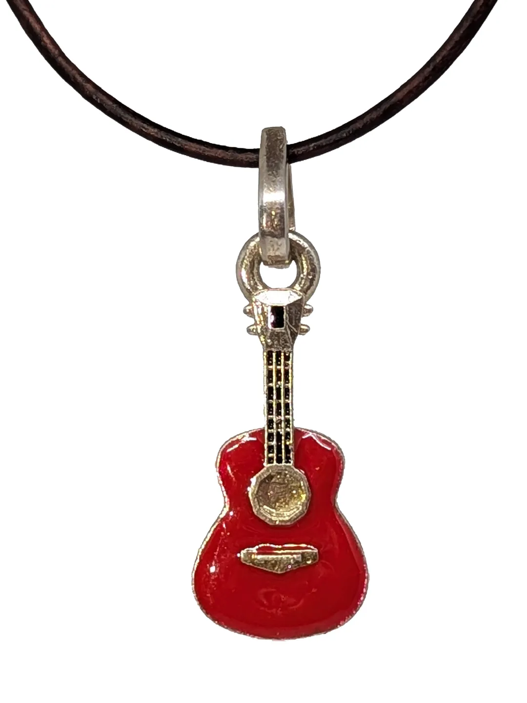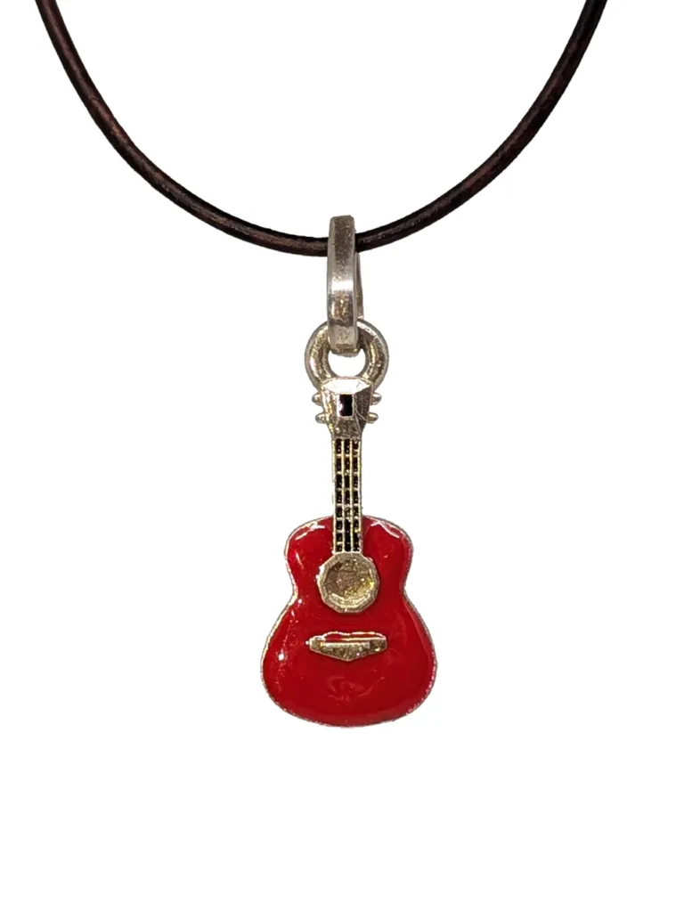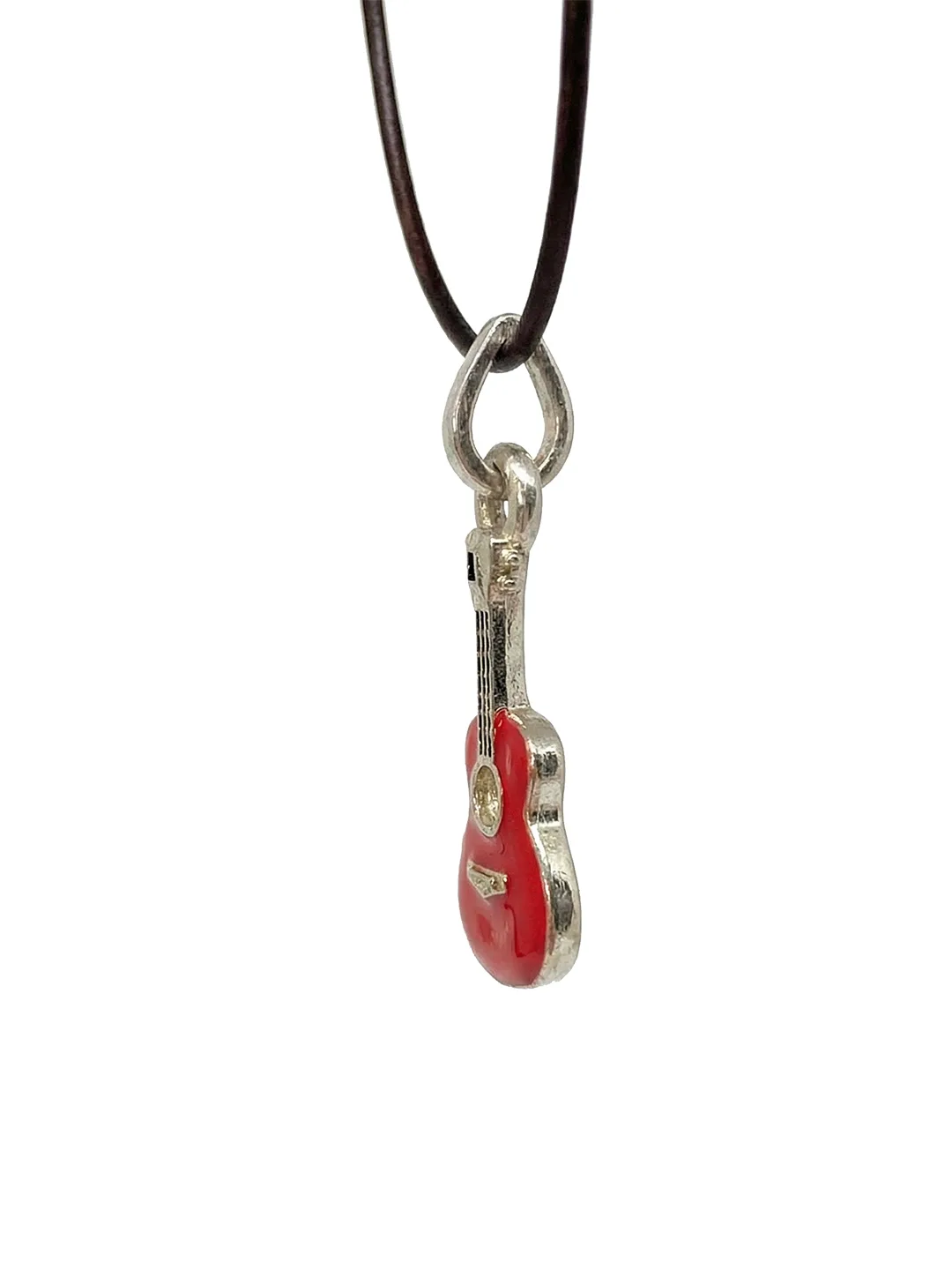 Sterling Silver Guitar Pendant with Red Enamel and Adjustable Leather Strap